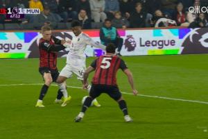 英超第31轮,曼联客战伯恩茅斯。67分钟,阿玛德禁区内倒地,裁判没有表示。伯恩茅斯随后发动反击扳平比分。