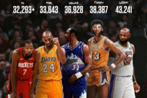 排在榜单下一位的是科比·布莱恩特,他领先杜兰特1349分。由于常规赛只剩下12场比赛,这一壮举不得不等到下个赛季。