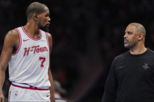 火箭球迷:这一通乱炖的 “控卫委员会” 和糟糕的单打战术,能打成这样也不奇怪。杜兰特来这儿不是当控卫的。